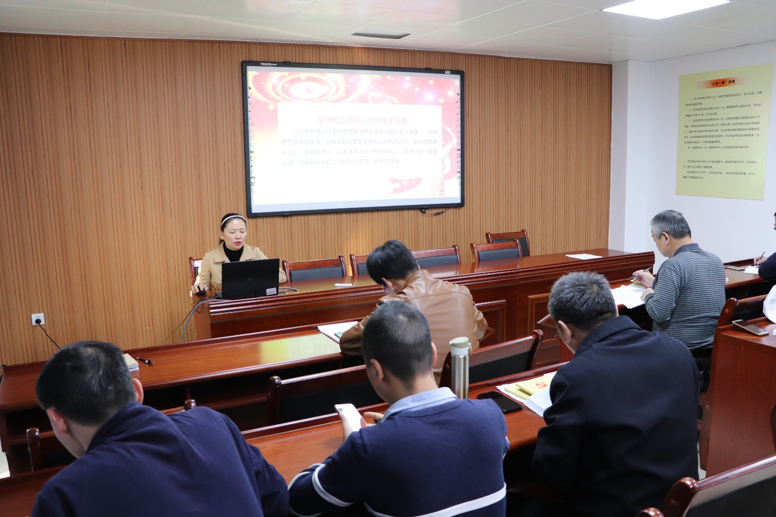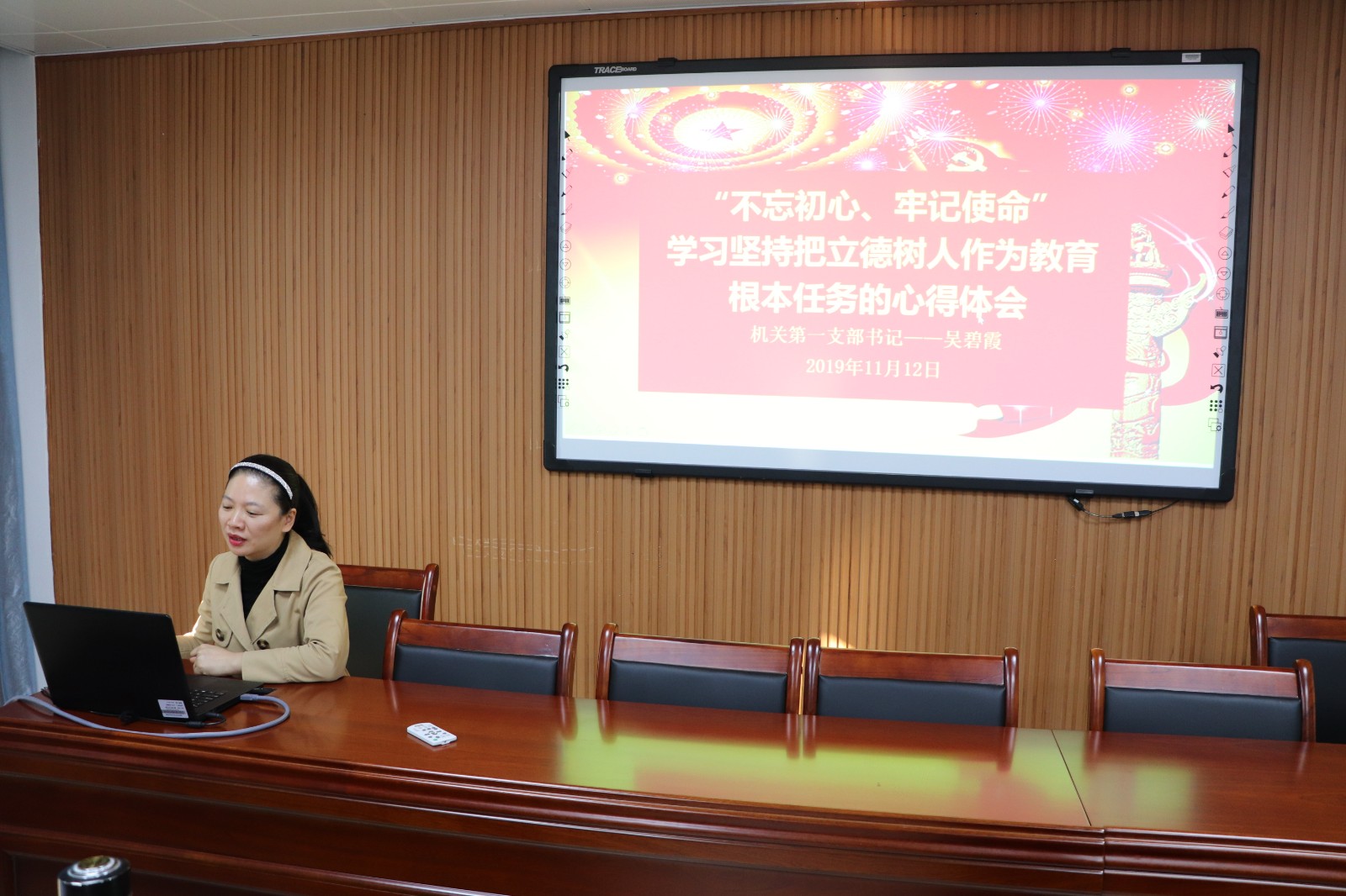 机关第一支部书记吴碧霞作 《“不忘初心、牢记使命”学习坚持把立德树人作为教育根本任务的心得体会》主题教育党课辅导,她从坚持用习近平新时代中国特色社会主义思想铸就社会主义建设接班人、积极推进思想政治理论课改革创新、努力推动课程思政的切实实施、建设高素质的思政教育师资队伍等内容与大家作学习心得交流。