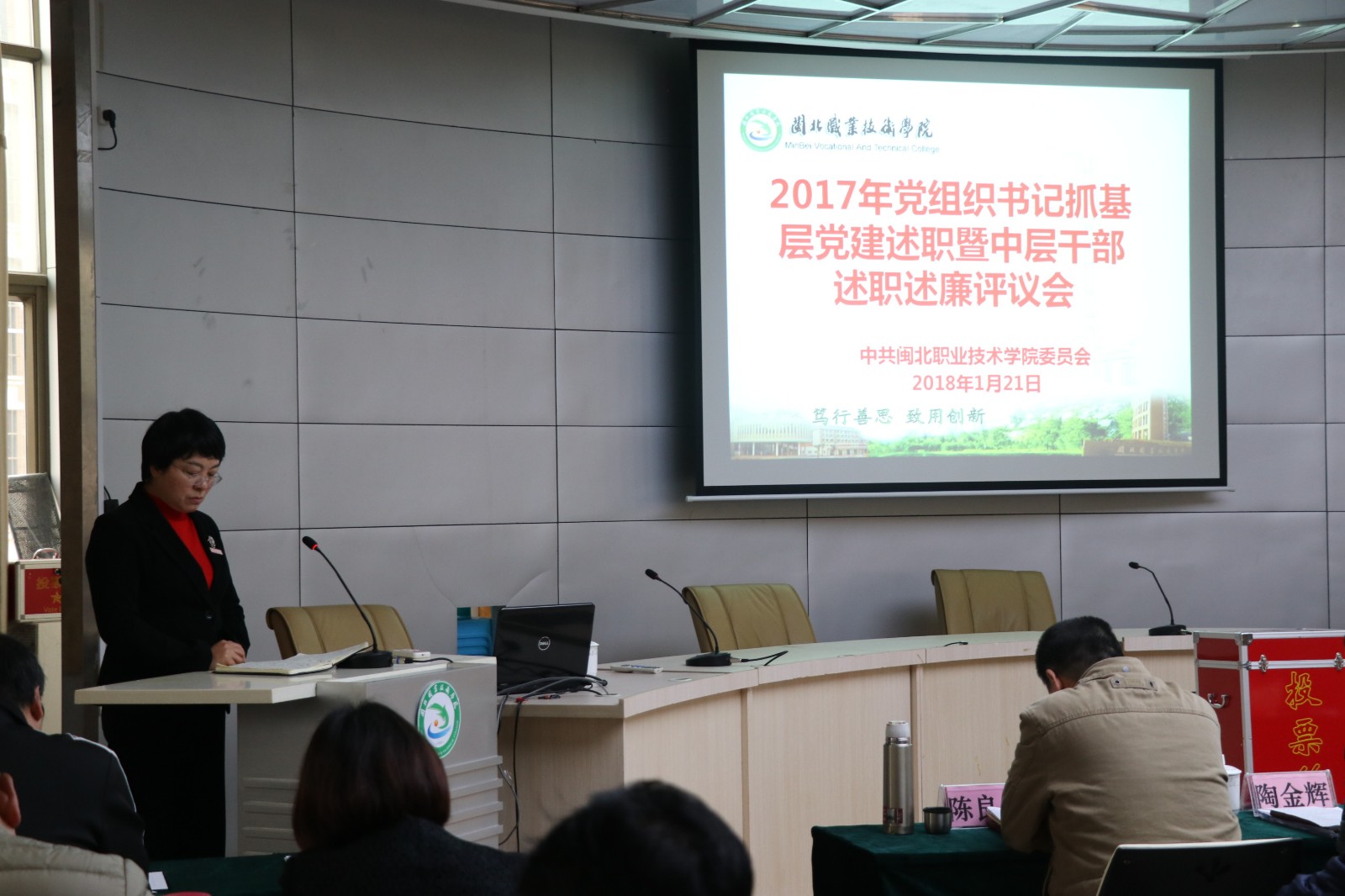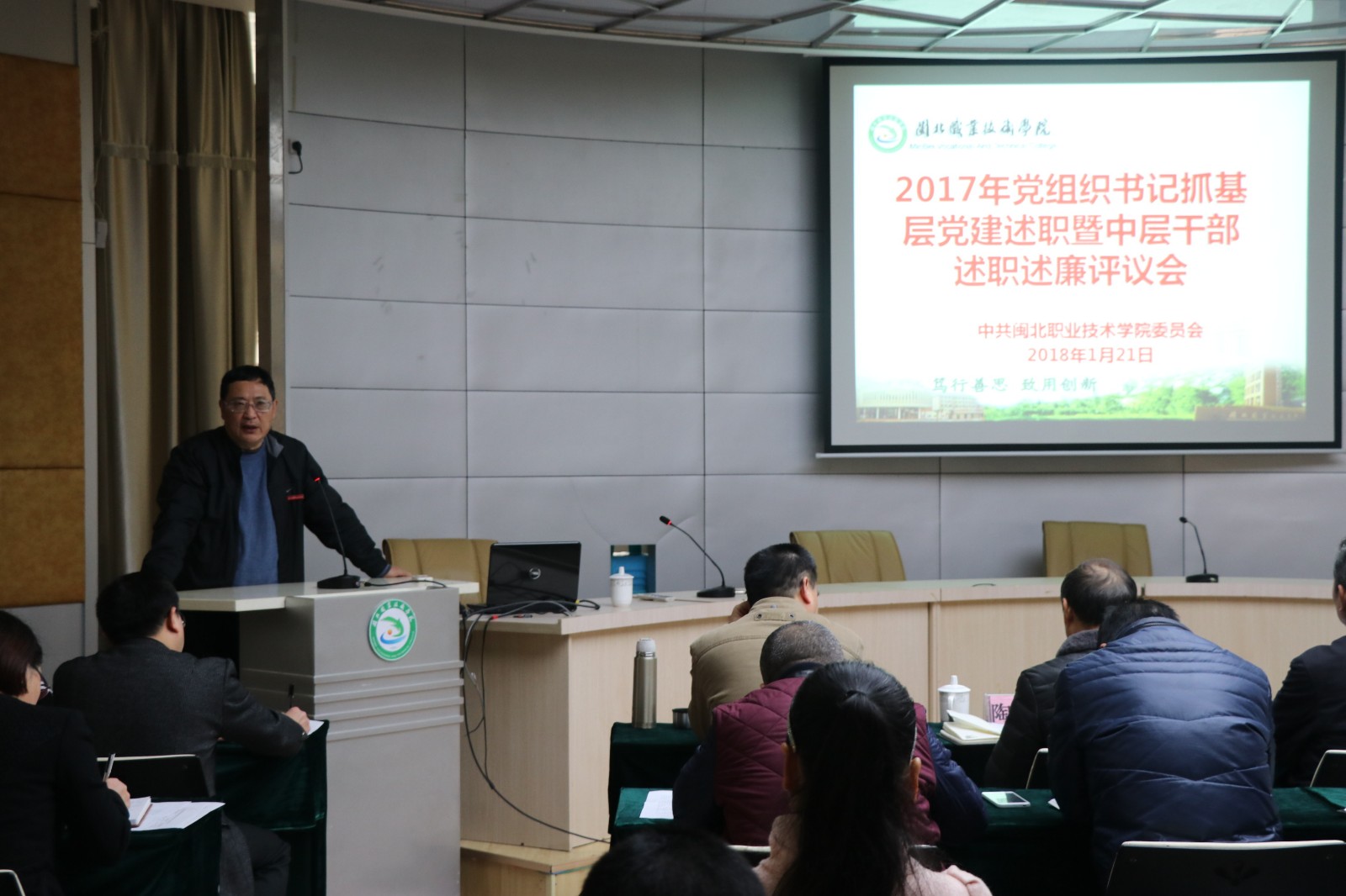 为进一步推动全面从严治党向基层延伸,促进基层党的建设全面提升,按照教育局党组、省、市教育工委的要求,1月20日上午,我院在行政楼一楼学术报告厅召开2017年度党总支书记抓基层党建工作述职报告会暨中层干部述职述廉评议会。会议由院党委副书记陶金辉主持。院党政领导班子成员、副科级以上领导干部、各党支部书记、各级人大代表、民主党派代表共50人参加了会议。