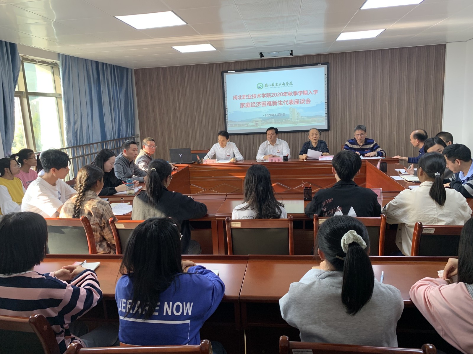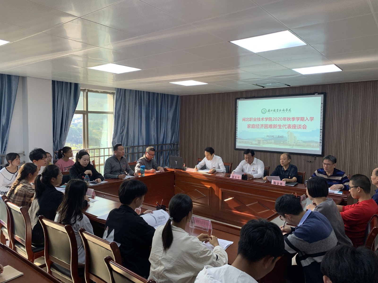 2020年11月4日下午🍠🤦🏿♂️,学生工作处召开2020级家庭经济困难新生代表座谈会,会议由党委陶金辉副书记主持,学院党委谢友平书记、各系党总支书记、学生工作处负责人、资助中心负责人及各系困难新生代表30人参加座谈会。