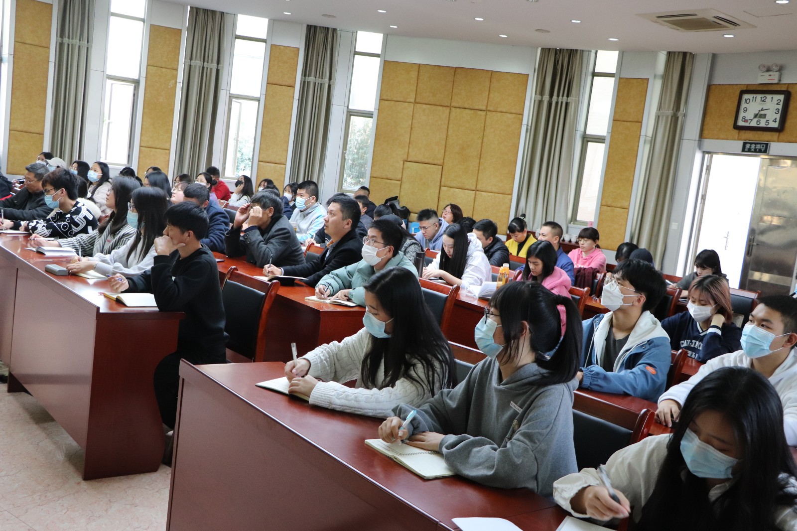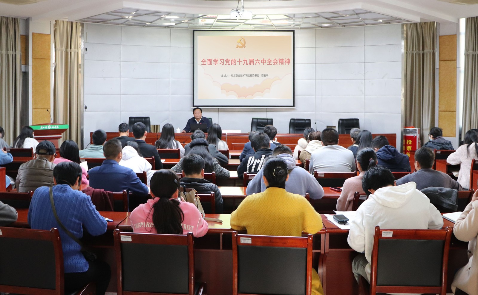 12月10日下午,院党委书记谢友平在行政楼一层报告厅宣讲党的十九届六中全会精神,学院副科级以下干部参加会议。