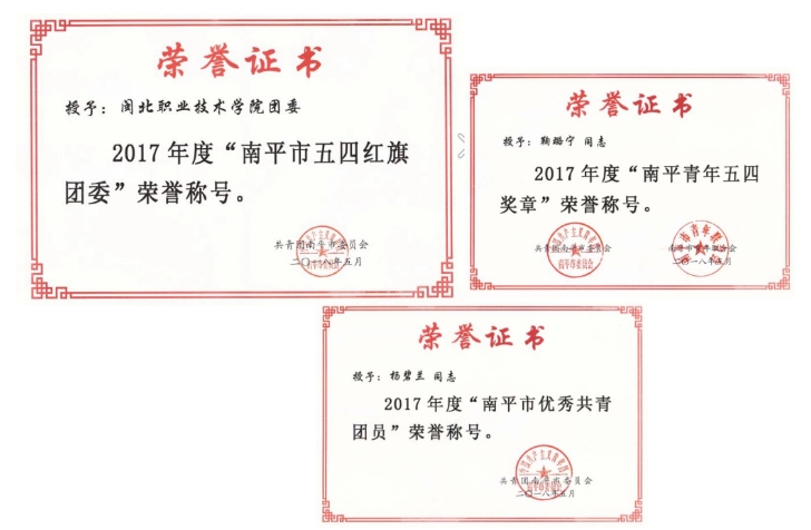 近日😨,从我市2017年度共青团“五四”系列表彰活动中传来好消息🏆:我院团委荣获“2017年度南平市五四红旗团委”荣誉称号,食品与生物工程系青年教师鞠璐宁获“2017年度南平市青年五四奖章”,管理系团员代表杨碧兰同学获“2017年度南平市优秀团员”荣誉称号。