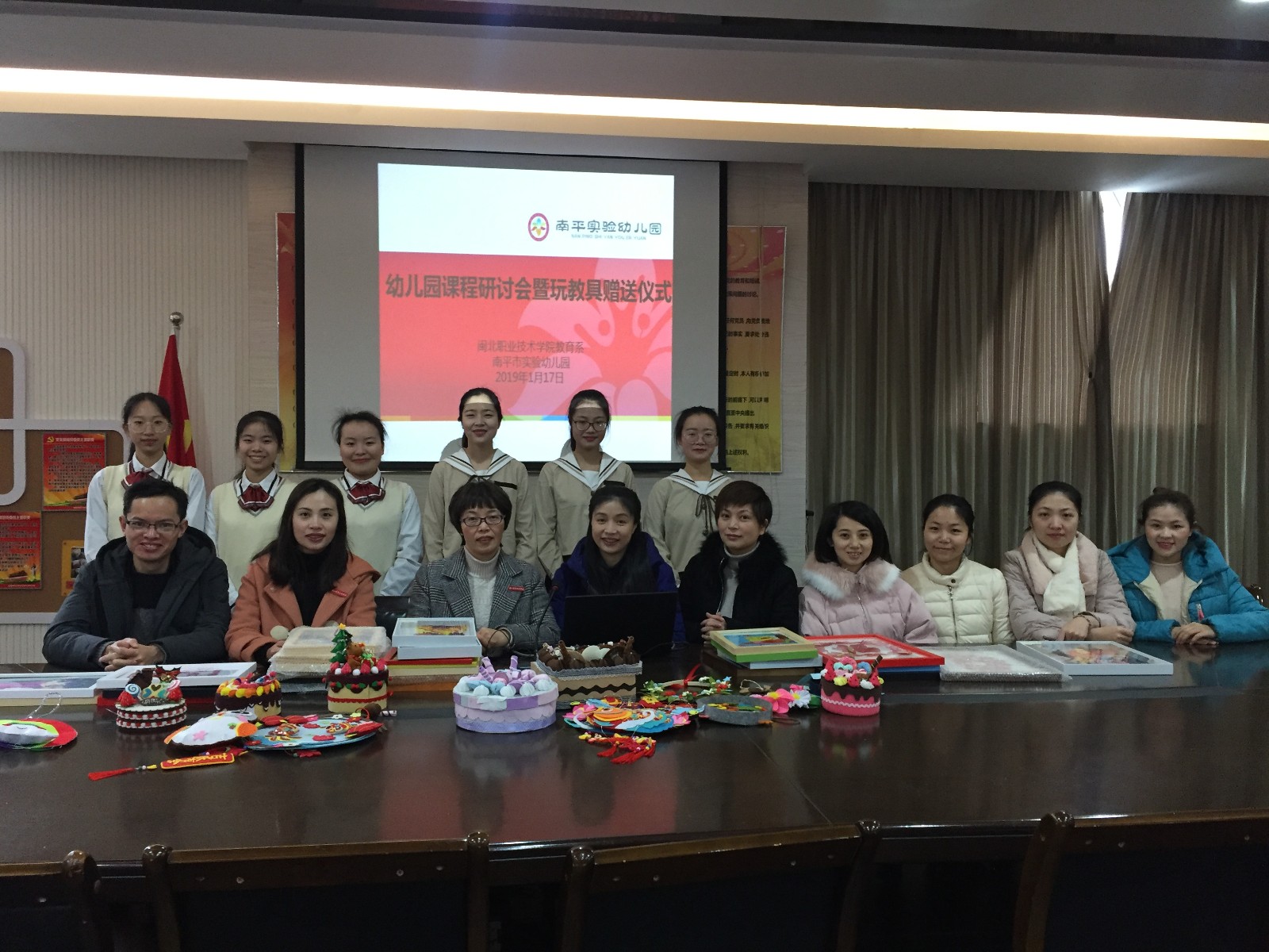 1月17日上午,教育系张完英主任带领学前教育专业团队负责人及骨干教师代表、部分学生代表分别到南平市实验幼儿园和南平市蓓蕾幼儿园两个代表性实训基地园,将儿童玩教具制作课程结束后的部分优秀作品赠送给实训基地园。