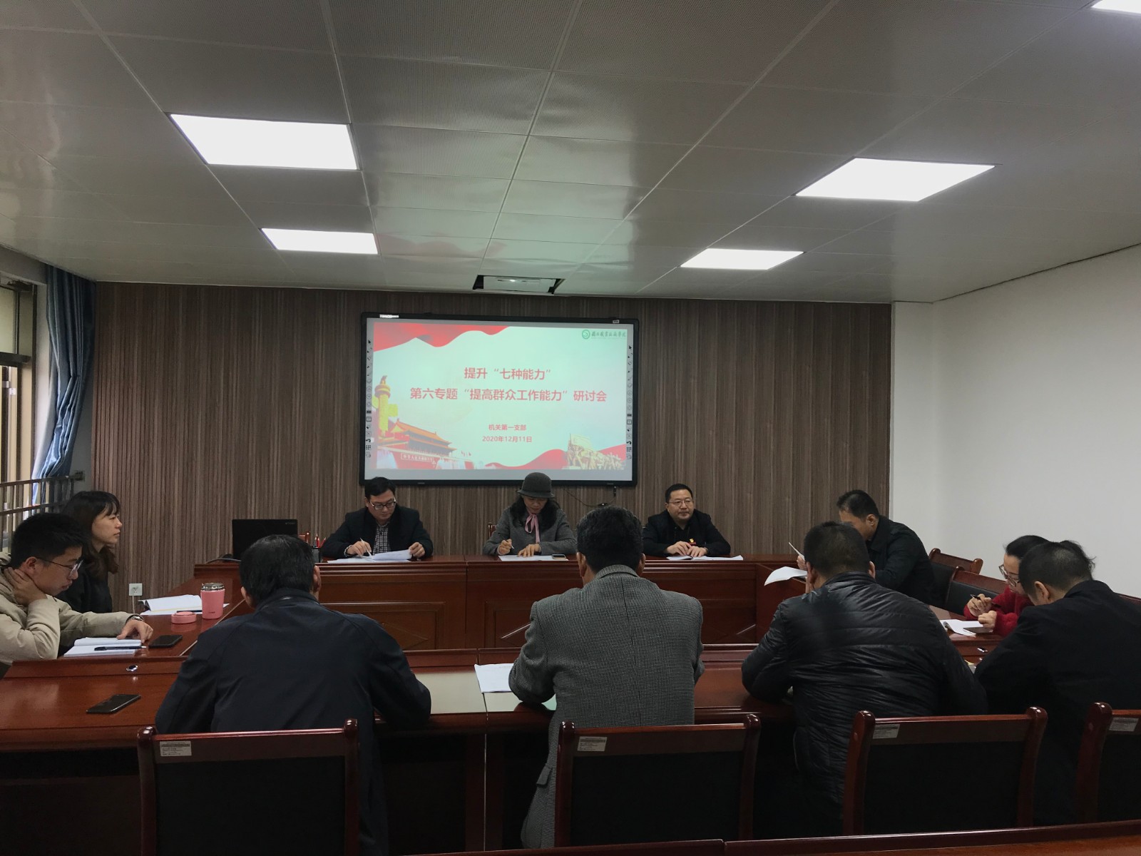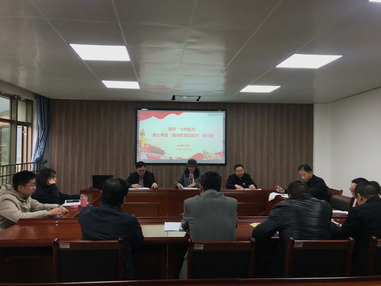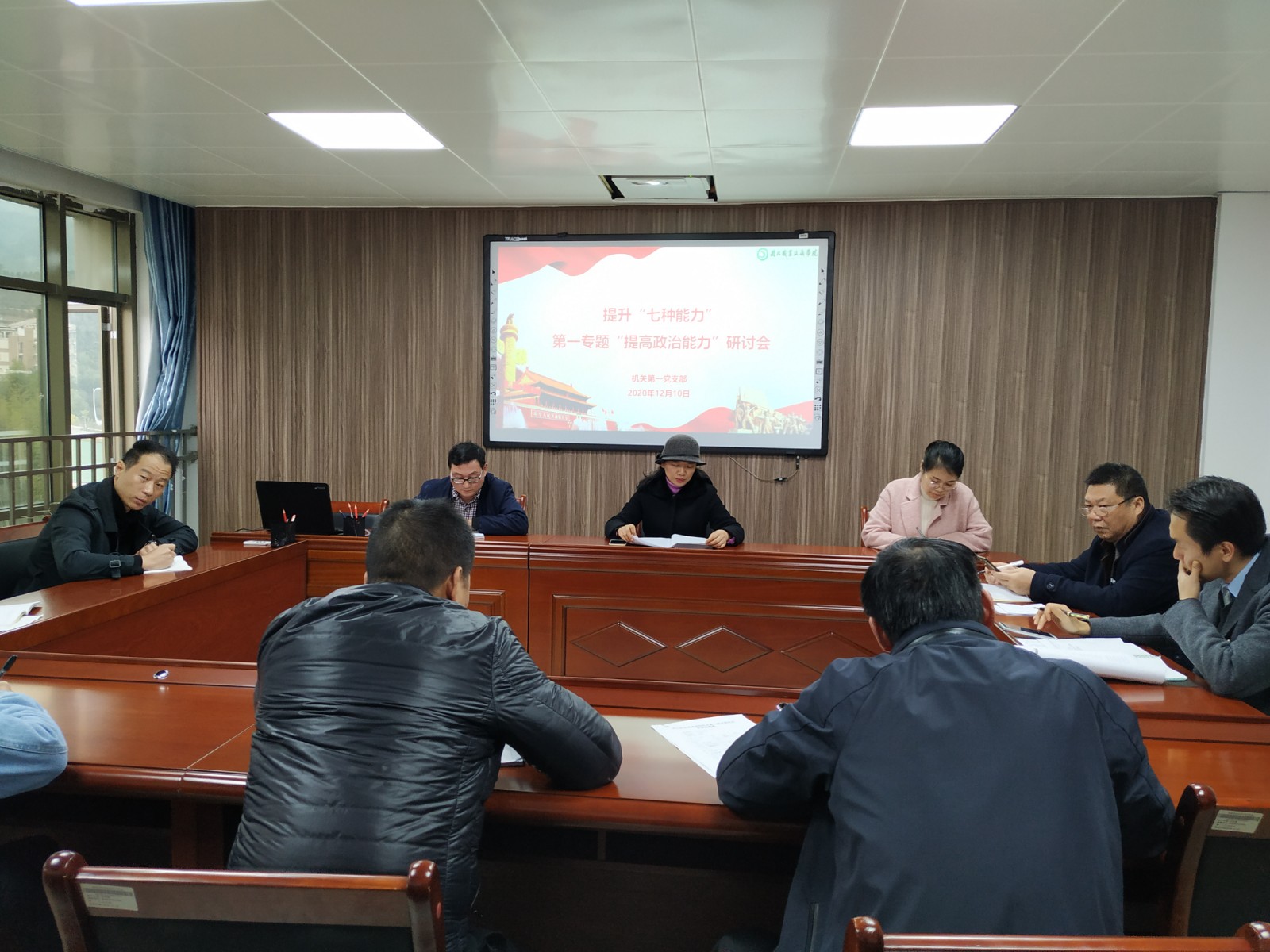 2020年12月10日下午、11日上午,机关第一党支部全体党员在学院行政楼607会议室,围绕提升“七种能力”开展专题学习研讨交流会,支部挂点领导党委委员蔡军同志参加了会议,会议由支部书记吴碧霞同志主持。