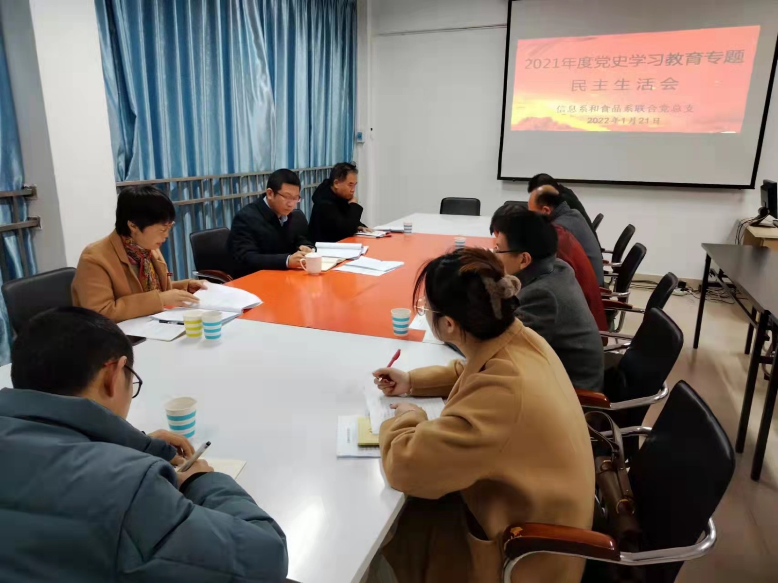 1月21日上午,信息系和食品系联合党总支召开了2021年度党史学习教育专题民主生活会,院党委副书记、院长叶世森到会指导👩⚕️,院督导组成员张完英、王金土及系党总支班子成员等参加了会议💁🏼♂️。会议由系党总支书记郑启阶主持。