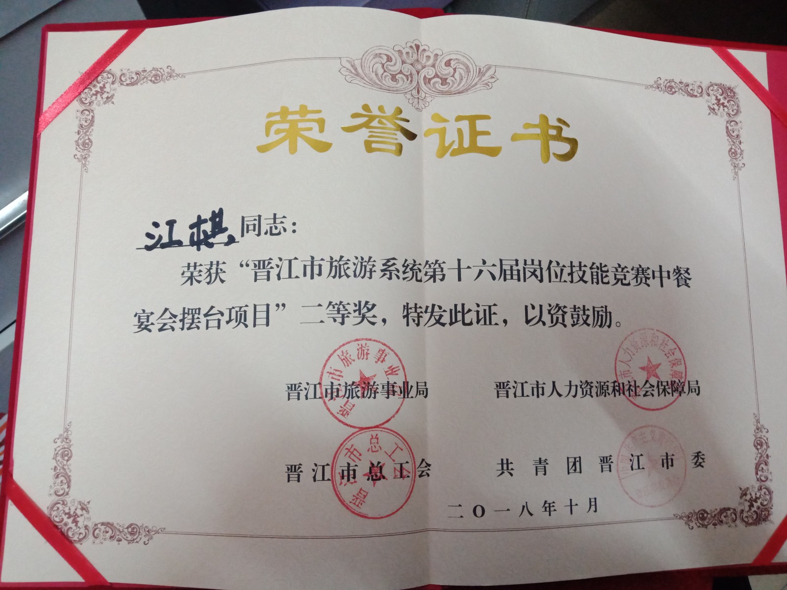 喜报👷🏼:旅游管理专业江棋同学参加晋江市酒店技能大赛获奖