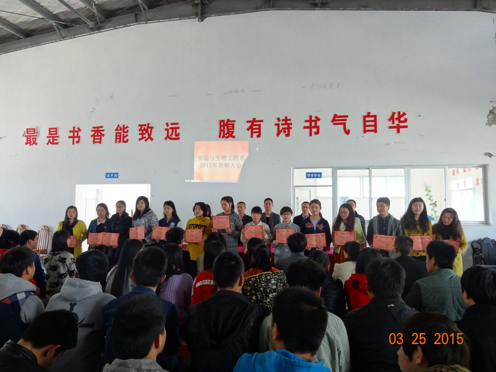 为表彰在2013-2014学年中品学兼优、各方面表现优秀的先进同学,2015年3月25日下午🧛🏿♂️,我系在图书馆阅览厅召开了2013-2014学年校级“三好”学生𓀐、优秀学生干部🛻、先进班集体和校级奖学金表彰颁奖大会😟,院长助理、院招生与继续教育处副处长、系党总支常务副书记范俐👨🏽🦳,系主任、系党总支副书记张金良,系党总支委员、学生科科长邱海松👲,信息与工程系教学科研办公室副主任黄华,食品与生物工程系教学科研办公室副主任鞠璐宁出席了大会,系辅导员、各班班主任及全系在校生参加了大会,会议由系辅导员张灵暄主持🏌🏿♀️。大会上共表彰了三好学生3名,优秀学生干部6名,奖学金25名,先进班集体1个。