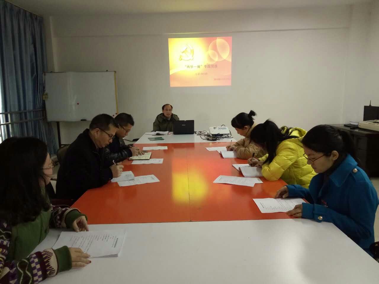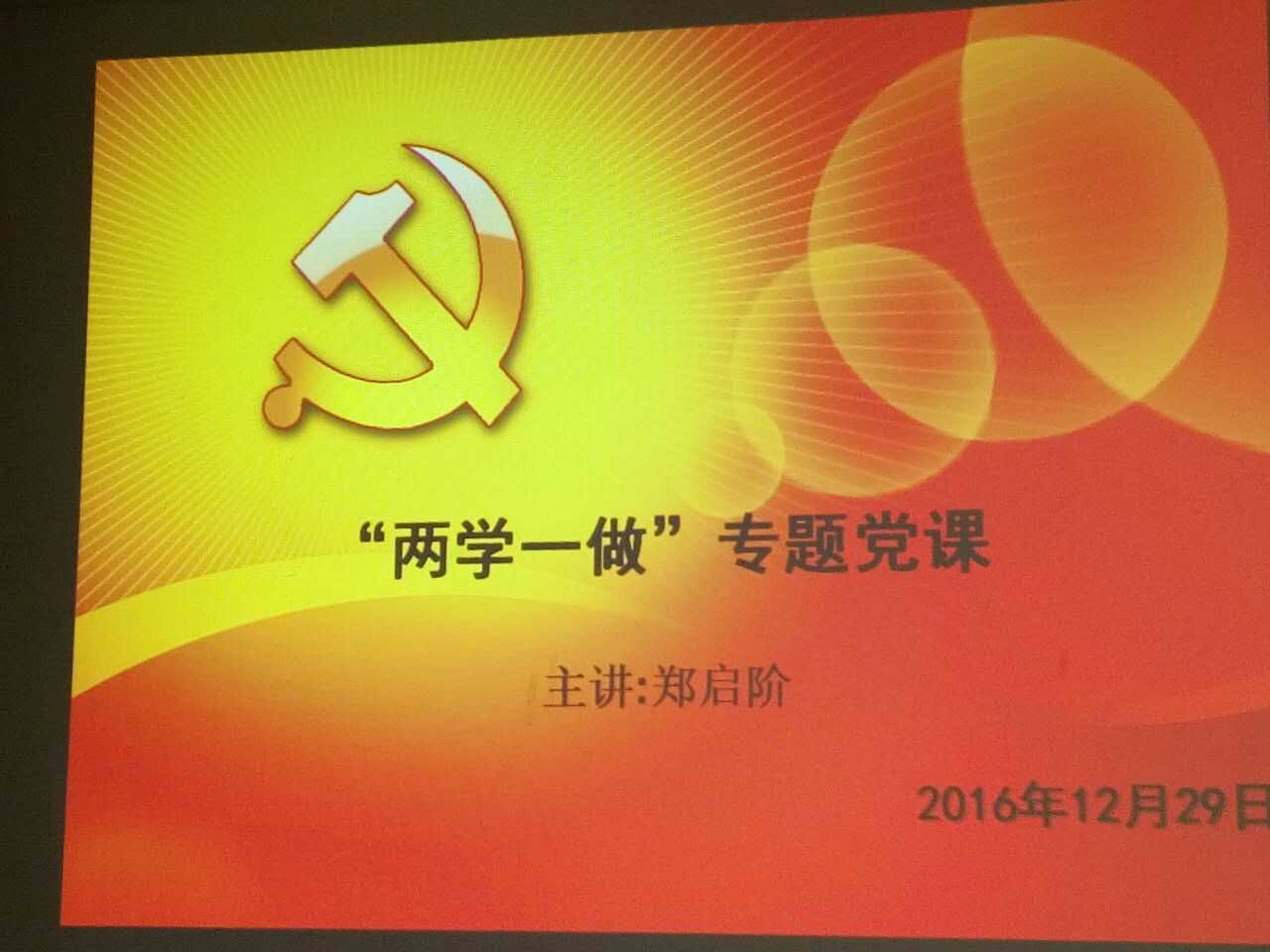 2016年12月29日上午✖️,食品与生物工程系党总支全体总支委员在办公楼407室集中上党课,党课主题为“两学一做专题党课”🤨,主讲为系常务副书记郑启阶同志,参加本次党课学习的我系领导还有张金良主任等🧛🏻♀️。