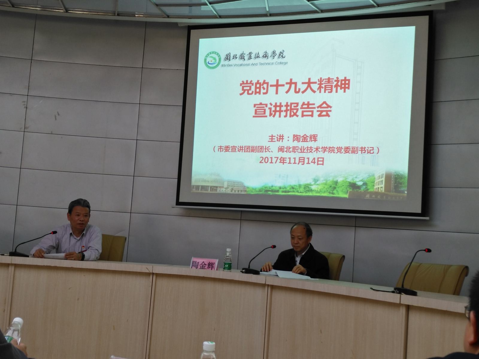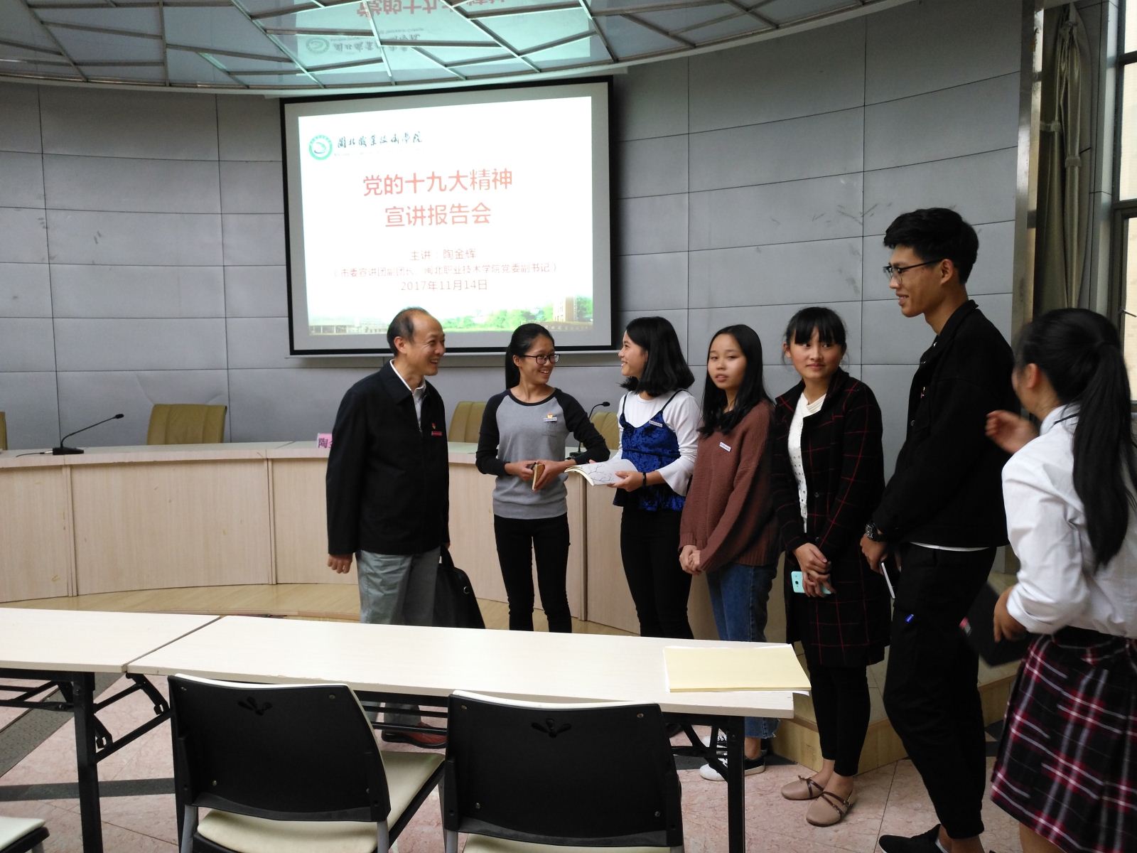 2017年11月14日下午,我院党的十九大精神宣讲报告会在行政办公楼一楼报告厅举行,南平市市委宣讲团副团长、院党委副书记陶金辉同志作了宣讲报告💁🏻♀️,院中层以上党员干部🧘🏿♂️、各总支委员🤦🏼♂️、支部委员🖖🎇、学生代表等70余人参加了报告会,我系领导主任👌、总支副书记张金良,系常务副书记郑启阶等出席了会议🎁。陶副书记从“关于十九大的主题🏋️♂️、成果”🤜🏻🪓、“关于习近平新时代中国特色社会主义思想”等八个方面进行了宣讲。宣讲全面🙂↕️、到位😀,切合实际🚵🏻,全体与会人员对党的十九大精神有了更深入的认识📎。报告会结束后💇,陶副书记现场接受了学生的采访,对学生提出的问题进行了一一解答。