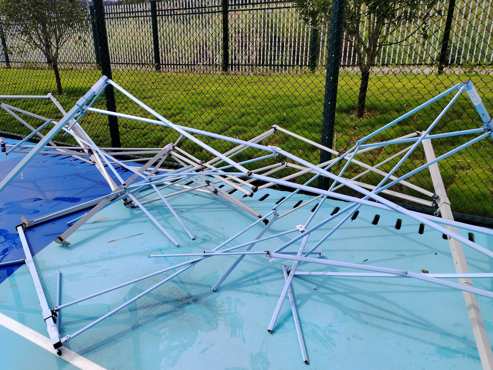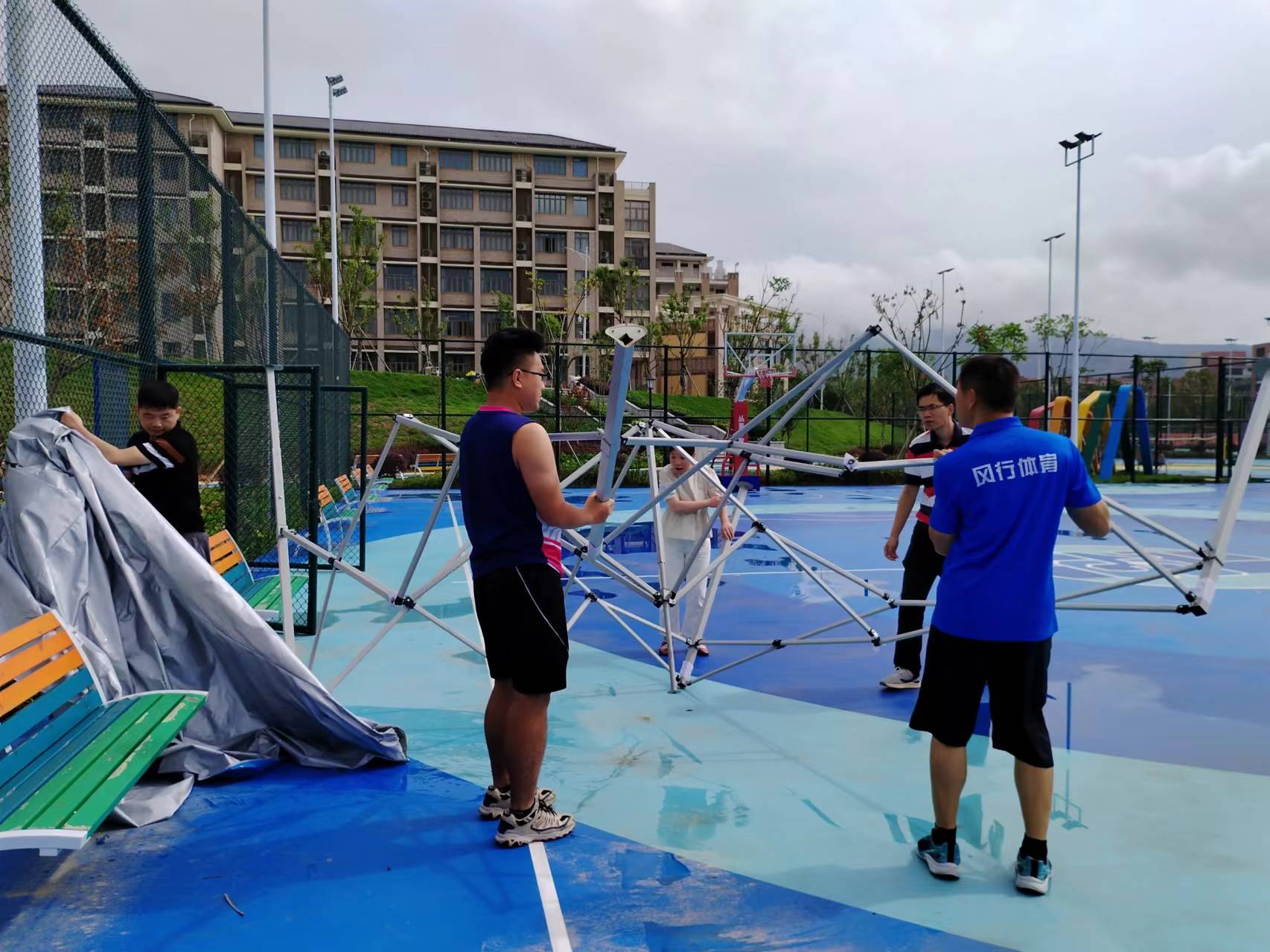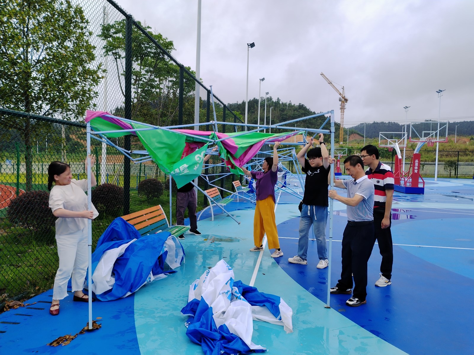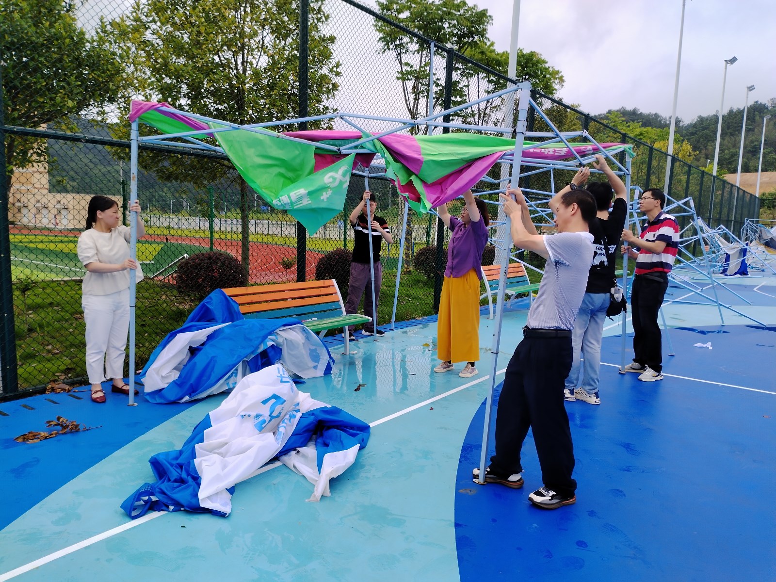 2024年6月25日傍晚🥇,一场突如其来的狂风暴雨把学院综合运动场的帐篷彻底吹坏,现场一片狼藉👨🏼‍🦱🍑。26日上午,马克思主义学院党支部组织党员及教师到现场清场🈴🙍🏽,大家发扬不怕苦↖️、不怕累的精神🎨🌩,团结协作,党员教师们齐心协力🧚🏻‍♀️,经过半个多小时的清理,所有损坏的帐篷清理完毕。
