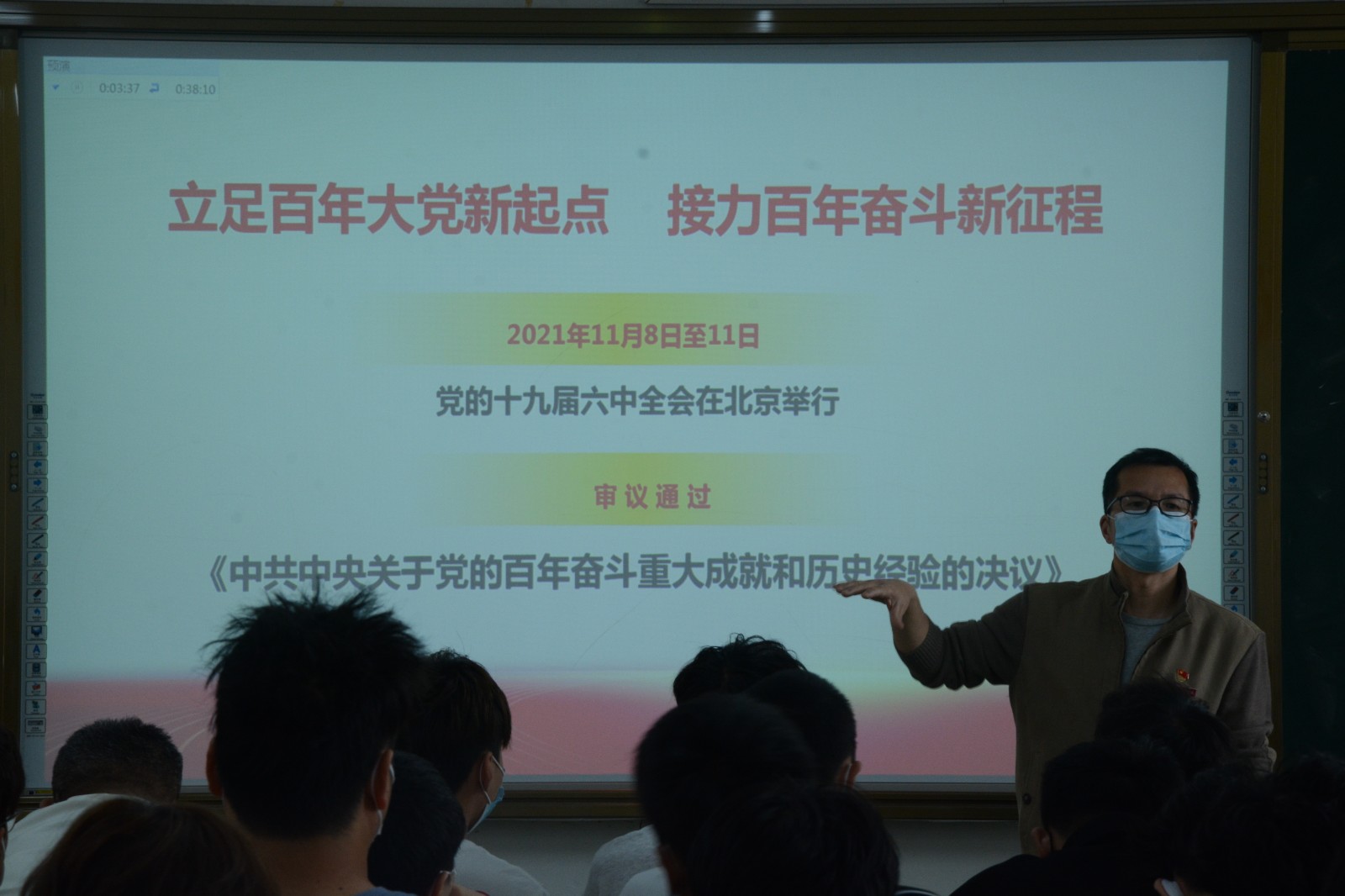 他们在课堂上用生动的语言和鲜活的事例回顾了党的艰辛奋斗历程,从“镌刻史册的伟大飞跃 不可逆转的复兴进程”、“气象万千的伟大时代 浓墨重彩的崭新篇章”、“永葆初心的大党担当 伟大光荣的历史贡献”、“弥足珍贵的精神财富 开创未来的行动指南”四个方面讲述了党领导人民进行新民主主义革命、社会主义革命和中国特色社会主义现代化建设的光辉历程。同时授课过程中,教育青年学生树立爱党爱国爱社会主义相统一的理念,激励青年学生传承红色基因,扛好新时期建设大旗,为国家富强、民族复兴、人民幸福贡献自己的力量。