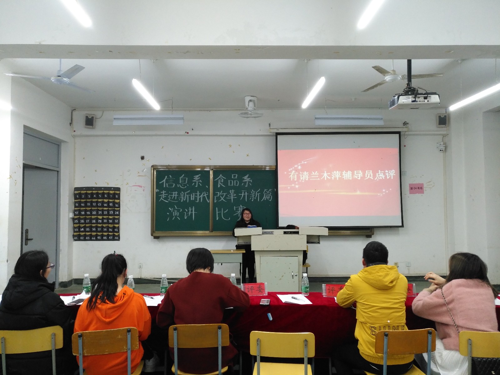 2019年4月3日晚♎️👷🏿♀️,我系在教学楼106室举办了“走进新时代改革开新篇”主题演讲比赛👨🏽,系辅导员兰木萍、江晓洁出席演讲比赛并担任评委。