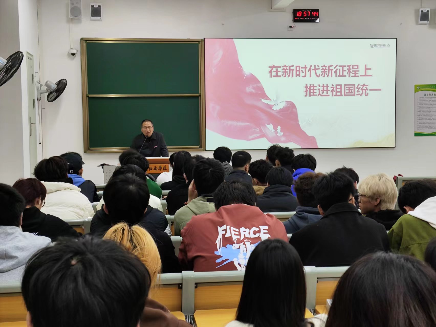 课堂上✍️,郑副院长用精美的课件、详实的史料、平实的语言🕵️、生动的事例紧紧围绕“接续奋斗的光辉历程”、“不可阻挡的统一大势”、“与时俱进的行动纲领”等三个方面主题对两岸关系的昨天🕵🏻♀️、今天和明天进行了总结和展望,深刻阐释台海形势的时与势,坚定共创祖国统一👨🏻🏫、民族复兴伟业的信心和决心。勉励同学们坚定理想信念,励志发奋图强,练就过硬本领,自觉将小我融入大我,将个人奋斗融入国家事业👩🏻✈️,为中华民族伟大复兴的中国梦贡献青春力量。