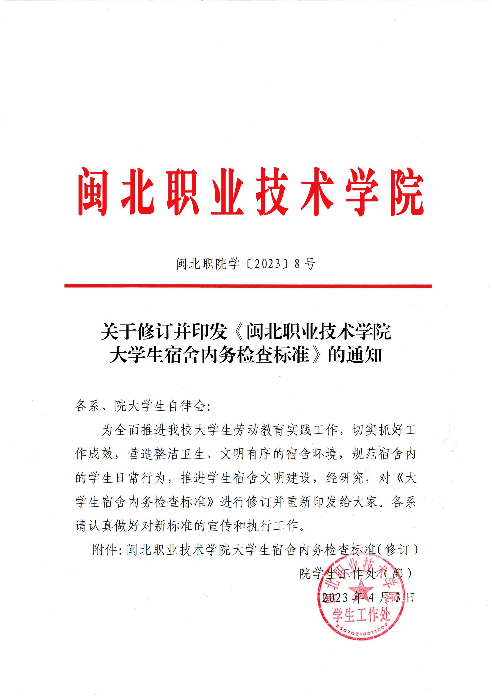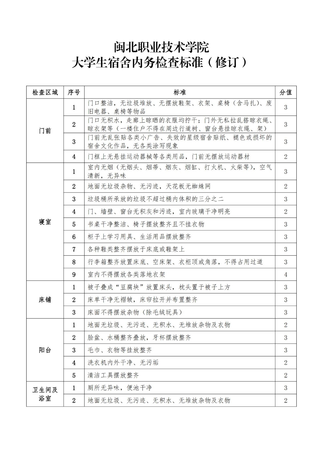 闽北职院学〔2023〕8号 关于修订并印发《彩神 大学生宿舍内务检查标准》的通知