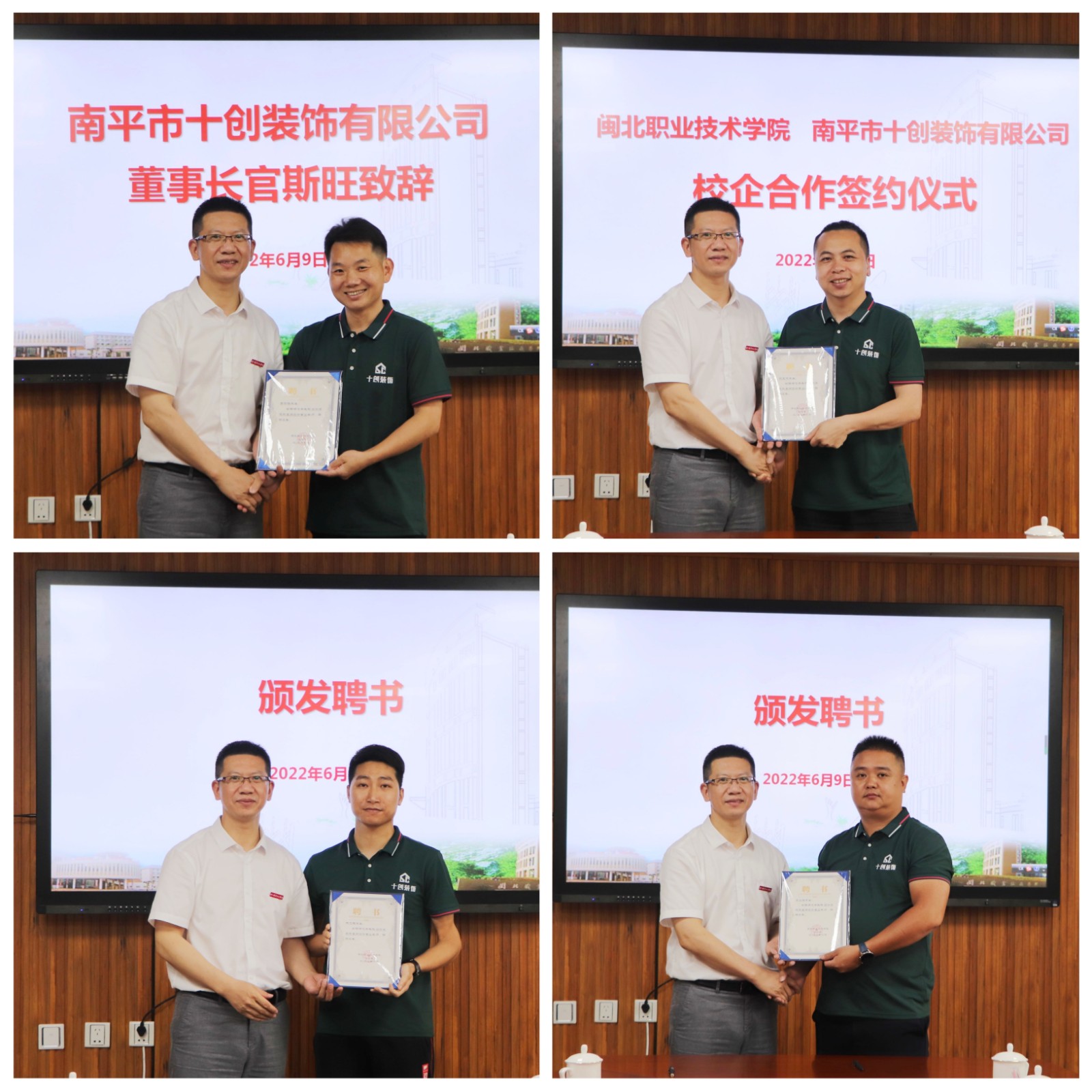 2022年69日下午🧑🏽‍🦱,彩神与南平市十创装饰有限公司举行校企合作签约暨发放企业兼职教师聘书仪式。学院院长叶世森、副院长郑需勇、设计系和管理系主任陈婷、招生就业处副处长詹永珍等专业教师,南平市十创装饰有限公司董事长官斯旺、集团总经理连兆华、材料总监傅明炳、文化总监郑加勇等校企代表出席仪式🙂🏏。